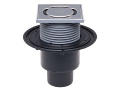 Подов сифон, DN50/75/110, долно оттичане, фланец за хидроизолацията, суха клапа против миризми, наставка с променяема височина 12-70 мм и рамка 123 х 123 мм, решетка 115 х 115 мм от неръждаема стомана и полирана.