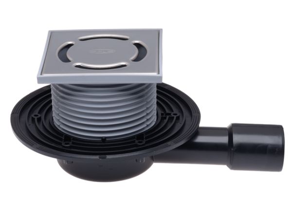 HL90.2 Подов сифон за тераси и балкони DN40/50, странично оттичане, фланец, решетка, клапаПодов сифон за тераси и балкони DN40/50, странично оттичане, фланец за хидроизолацията, с клапа против миризми и замръзване, наставка с променяема височина 12-70 мм и рамка 123 х 123 мм, решетка 115х115мм от неръждаема стомана и полирана.