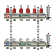 Колектор 1" Ж/Ж с разходомер, автоматичен обезвъздушител и дренаж – 6 отвора, неръждаем