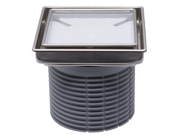 Наставка d 110 мм / 132 x 132 мм с видима част за вграждане на индивидуални плочки с рамка от неръждаема стомана, легло за плочките 112 x 112 мм. Обща дълбочина 80 мм, височина на рамката 10-27 мм. Предпазен капак * в опаковката. Размери на леглото за плочките 104 x 104 x 12 мм
