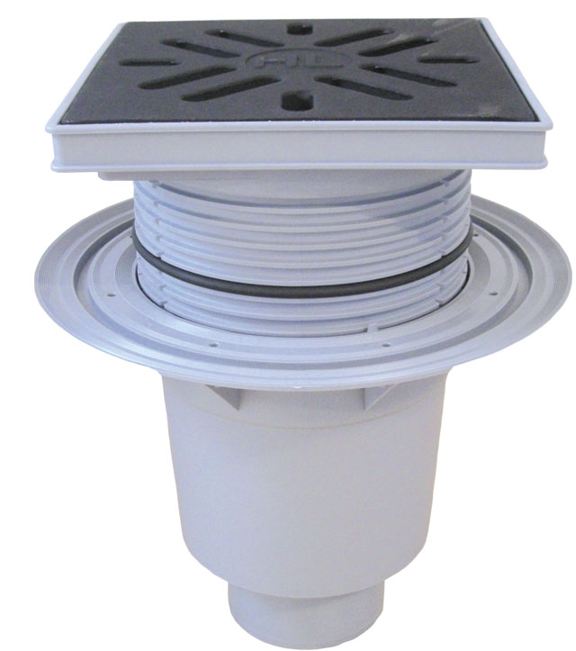 PERFEKT-подов сифон DN110, долно оттичане, фланец за хидроизолацията(но без гарнитура), с пластмасова наставка с променяема височина 55-135 мм, с чугунена рамка 260 х 260 мм, решетка от чугун 226 х 226 мм, пясъкоуловител и клапа против канални миризми и замръзване.