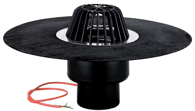 Воронка за плосък покрив DN160, долно оттичане, с термоизолирано тяло, вграден нагревател * саморегулиращ се (10 * 30 W), за директно свързване към мрежа 220V, със заводски заварена SBS битумна мембрана d 500мм за идеалното свързване с битумни хидроизолации, листоуловител d 180мм с UV защита.Защитната капачка при монтажа се съдържа в опаковката.
