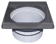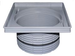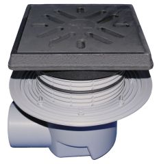 PERFEKT-подов сифон DN160, долно оттичане, фланец за хидроизолациятано(но без гарнитура), с пластмасова наставка с променяема височина 42-130 мм, с пластмасова рамка 240 х 240 мм, решетка от пластмаса 226 х 226 мм с винтове, пясъкоуловител и воден затвор.