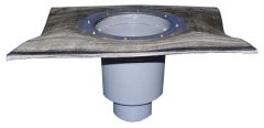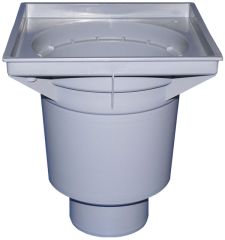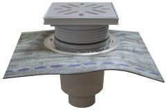 PERFEKT-подов сифон DN160, долно оттичане, фланец за хидроизолацията(но без гарнитура), с пластмасова наставка с променяема височина 42-130 мм, с пластмасова рамка 240 х 240 мм, решетка от пластмаса 226 х 226 мм с винтове, пясъкоуловител и клапа против канални миризми и замръзване.