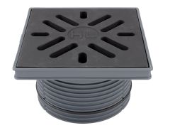 PERFEKT-подов сифон DN160, долно оттичане, фланец за хидроизолацията(но без гарнитура), с пластмасова наставка с променяема височина 42-130 мм, с пластмасова рамка 240 х 240 мм, решетка от неръждаема стомана (CrNi 18/10) 226 х 226 мм с винтове, пясъкоуловител и воден затвор.